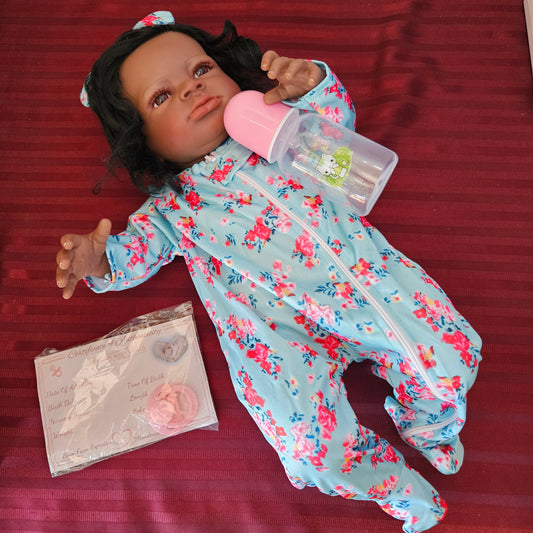 Bebé Reborn niña afroamericana ojos abiertos cuerpo de tela con cabello (Nuevo)